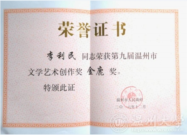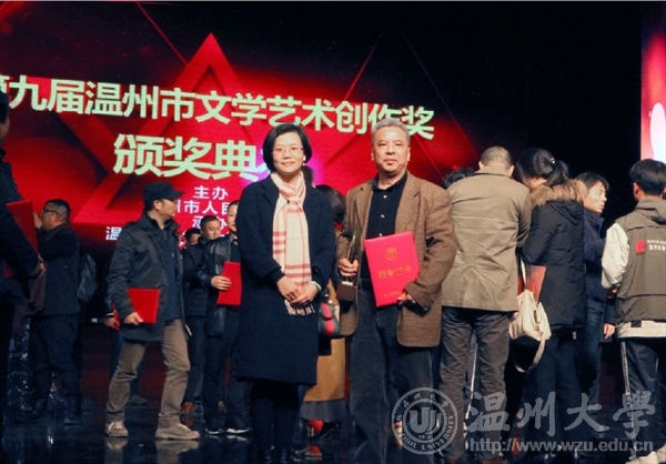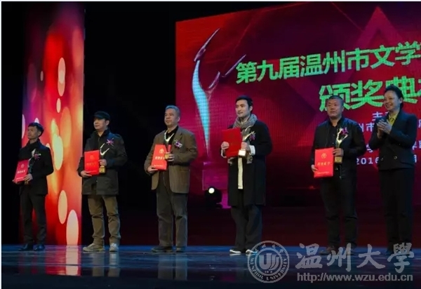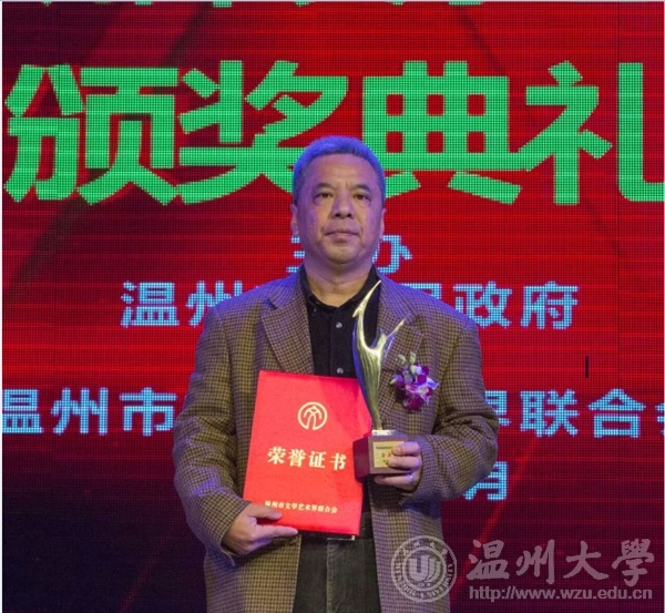 2016年12月29日下午,由温州市人民政府主办,温州市文学艺术界联合会承办的第九届温州市文学艺术创作奖颁奖典礼在温州市工人文化宫成功举办。必赢bwin线路检测中心李利民老师荣获金鹿奖,该奖项是温州市政府设立的文艺最高奖,每三年评选一次,温州市委常委、宣传部长胡剑谨,温州市副市长郑朝阳出席颁奖典礼并给金鹿奖获得者颁奖。