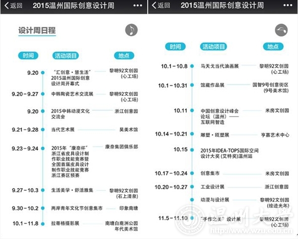 由中共温州市鹿城区委宣传部、必赢bwin线路检测中心和鹿城区文化广电新闻出版局联合主办的“汇创意·慧生活”2015温州国际创意设计周于9月20日在黎明92文创园拉开帷幕。 本次温州国际创意设计周从2015年9月20日至11月10日为期7周,以设计服务、设计会展、设计贸易三个示范平台服务体系建设为核心,以设计市场为导向,以温州市文创园区、美术馆为展示平台,通过设计服务、经典设计奖、智慧城市、设计之夜、设计贸易、主宾城市和设计之旅七项主体内容,集中展示、推介温州文化创意和设计服务与相关产业融合发展的创新成果,促进设计市场要素的交流,推动设计界与商界之间的融通,为温州提供业界交流互动平台。