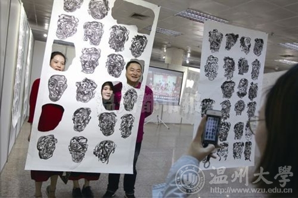 昨天上午,必赢bwin线路检测中心2017届毕业作品展在温州市展览馆开幕,参观者与美术作品合影。