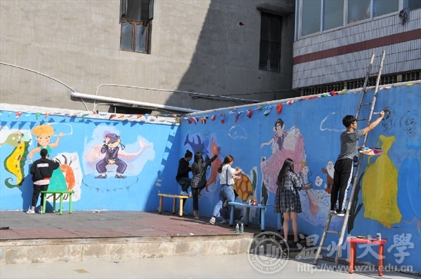 志愿者们经过大半个小时的车程终于到达终点站,踏入幼儿园发现,它并没有想象中那么现代化,墙上是被太阳曝晒过的稚嫩童画。刚到那里,志愿者们便开始着手准备,将颜料摊在地上,打水,洗笔……,有条不紊地进行着。随后每个人开始选自己要画的卡通人物,由于园长告诉我们,这是孩子们跳舞的场地,所以志愿者们也跟着主题走,上网搜集了许多可爱的卡通舞者,选好之后,二话不说就动起手中的水粉笔开始绘画,志愿者们先用铅笔打稿,用黑色颜料勾线,再上色。不一会儿,肉色的皮肤,粉红的裙子,精美的发饰,优雅的舞姿等便在蓝色的墙面上显现出来了。志愿者们大肆挥舞画笔,用嫩黄和天蓝颜色打底,在太阳底下让人看了温暖极了,太阳也愈演愈烈,志愿者们的头上也开始出现汗珠。上午的时间飞快地流逝,吃过饭后小憩一会,志愿者们便接着干活,同时又把墙面整体地刷了一遍,更突出了人物,再加上一些花花草草的点缀,整个围墙都漂亮醒目了起来。园长十分开心,志愿者们也很欣慰。快结束的时候,还有这边的上级领导来视察,夸奖了我们志愿者的工作成果,也给了一些有用的建议。