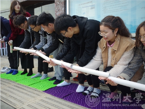 团干第一次户外培训活动在周日下午如火如荼的展开。突如其来的冷空气也阻挡不了同学们的热情。同学们在大学生活动中心依次排好等待培训的开始。一个成功的队伍必须拥有炫酷的队名响亮的口号和统一的队歌。同学们在短短十分钟内发挥想象在大卡纸上刷刷画下了队名和图案,并在完成后在各个队伍前展示。第一个项目是兔子舞同学们整齐的排成一个圈,接受重重挑战。这个项目不仅挑战了同学们的协调性也考验了大家的反应能力。在活动中反应不够灵敏的同学接受惩罚时也引起了同学的爆笑。从第二个项目开始,同学们分为两组分别进行活动。其中一二队同学进行的项目是挑战五分钟。同学们一个接一个用手中的管子运输小球,通过指压板,将小球投进篮中胜利。接下来一连串的项目都是靠大家齐心协力才能完成,默契最佳的组才能获胜。三四组同学的项目是贪吃蛇,两队除了蛇尾外的同学都带上了眼罩,在黑暗中,位于蛇头的同学在地上摸索着散落的木块,项目的关键就在于蛇尾同学的指挥和蛇身同学们的传达,一个协调的整体才能取得成功。接下来一二两组的项目是信任背摔。同学站在一米以上的站台上克服内心的恐惧,往后笔直一摔让背后搭成人桥的同学接住他才算成功。这一项目考验了同学们间的信任度与勇气。三四两组进行的是团队运输,将报纸做成履带同学们作为轮胎在起点与终点间运输气球,同学们默契配合,才能在短时间运输完成。最后一个项目是一方有难八方支援,同学们发挥出无私奉献的精神,应要求纷纷奉献出自己的衣服、鞋子、袜子、甚至是自己。在热火朝天的氛围中,培训画下了完美的句号。在此次培训中,团干们在互动中增进了情感,在比赛中培养了团队协作精神与默契度。相信团干培训活动会越来越顺利。