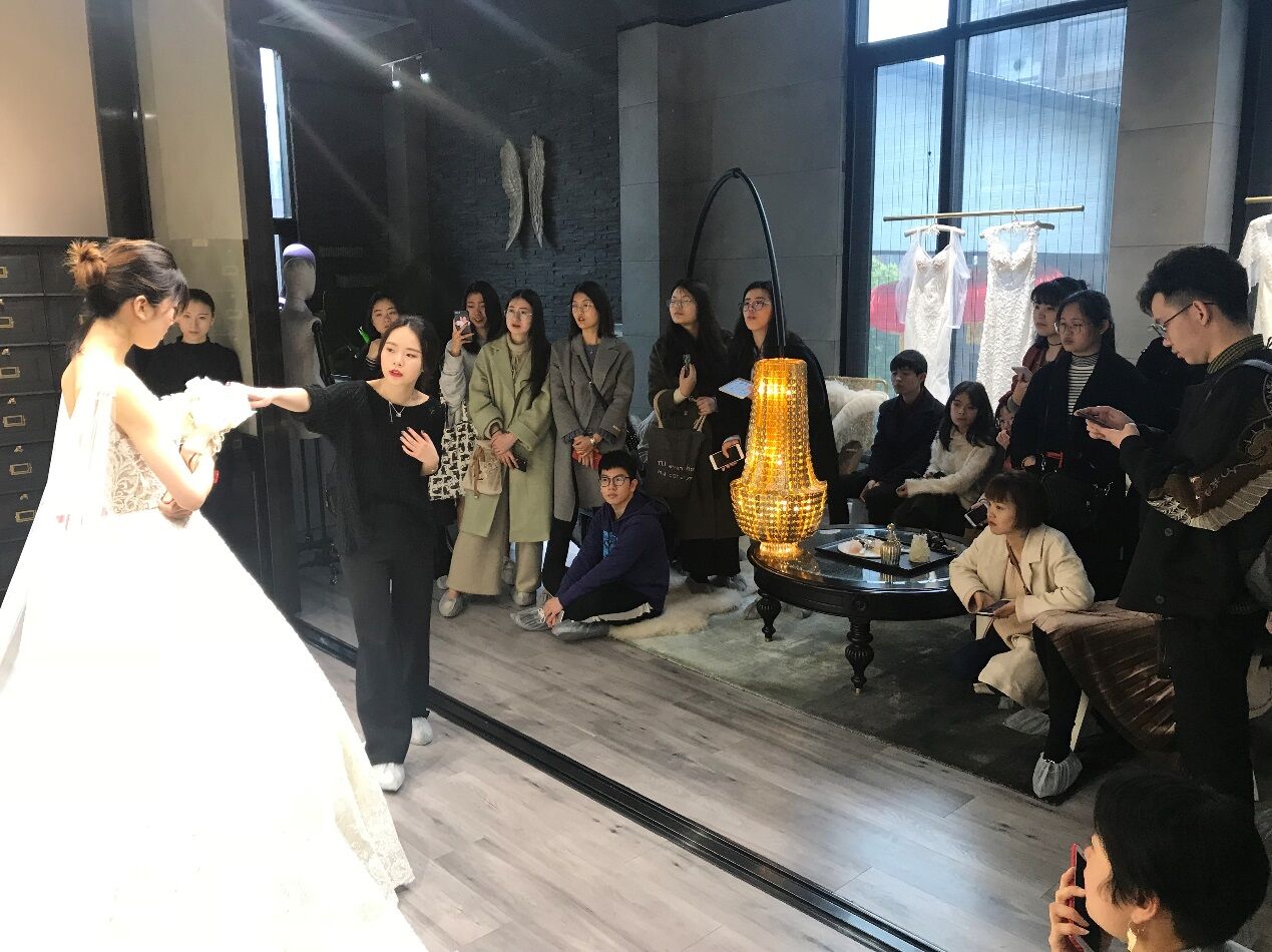 温州市鹿城区五马嫁依工坊婚纱店,是必赢bwin线路检测中心的校企合作定点单位,自2004年创立至今,已与国内外二十多家知名婚纱品牌合作,让臻美的大牌婚纱落地温州,为新娘带来了与国际结轨的尊享体验。此次我们参观的是2016年嫁依工坊新入驻米房开设的玩味定制婚纱体验馆“JOINFINE+”。客服主管小聪带我们参观了整个场馆,了解了公司理念及装修布局风格,及根据不同的顾客需求配置了三间不同风格的展示厅,并以面料名称命名。销售总监精心挑选了目前最新款、最具代表性的五件婚礼服给同学们进行了展示讲解。大家针对礼服的设计、面料、工艺、装饰、色彩、市场定位等专业问题展开了热烈的讨论与交流。