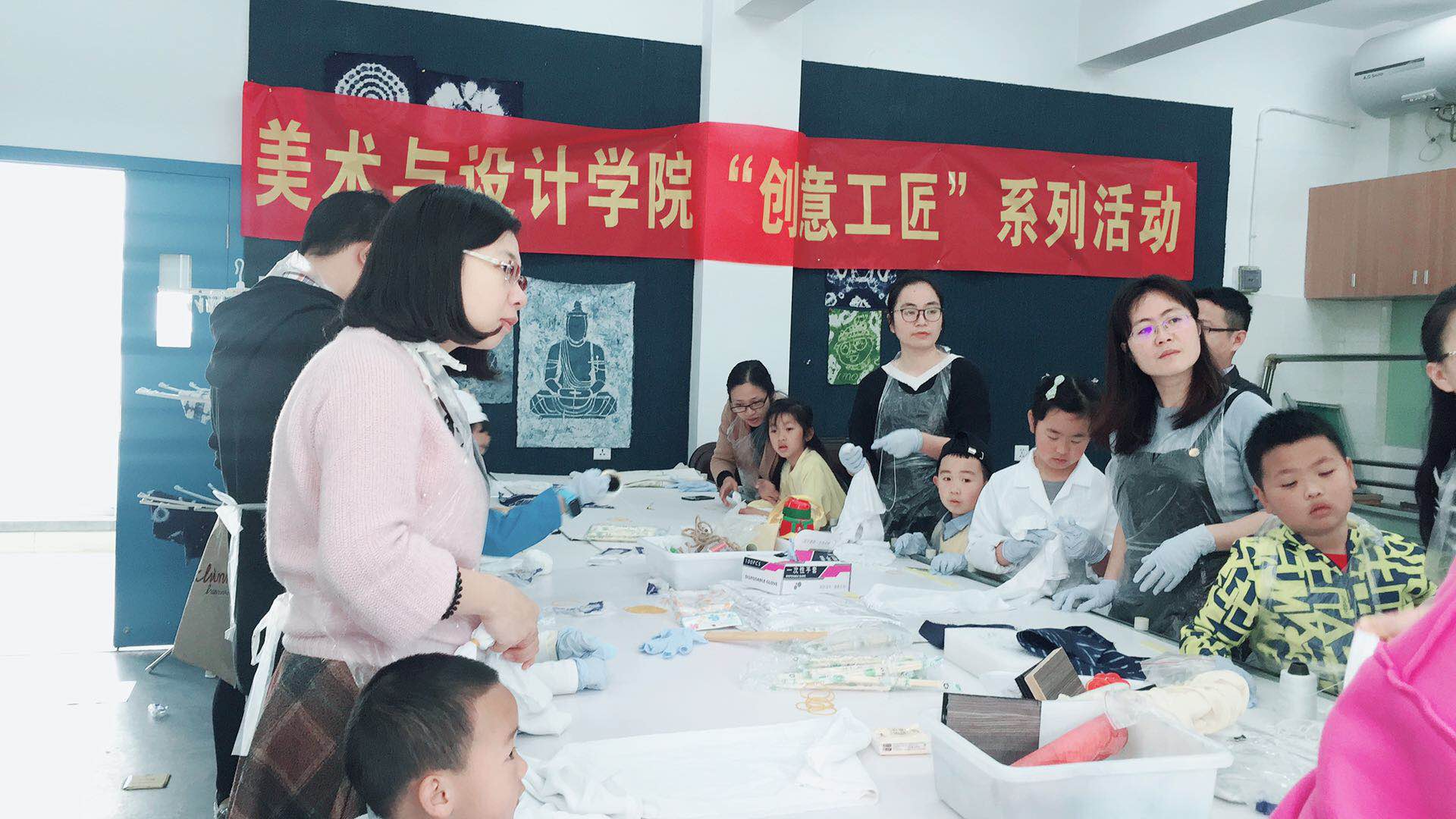 4月1日上午,必赢bwin线路检测中心开展了“亲子扎染”活动,美院学生创业团队皓翔美术团队组织家长和孩子们参与制作扎染围巾,并参观了美院工业设计等艺术展览。