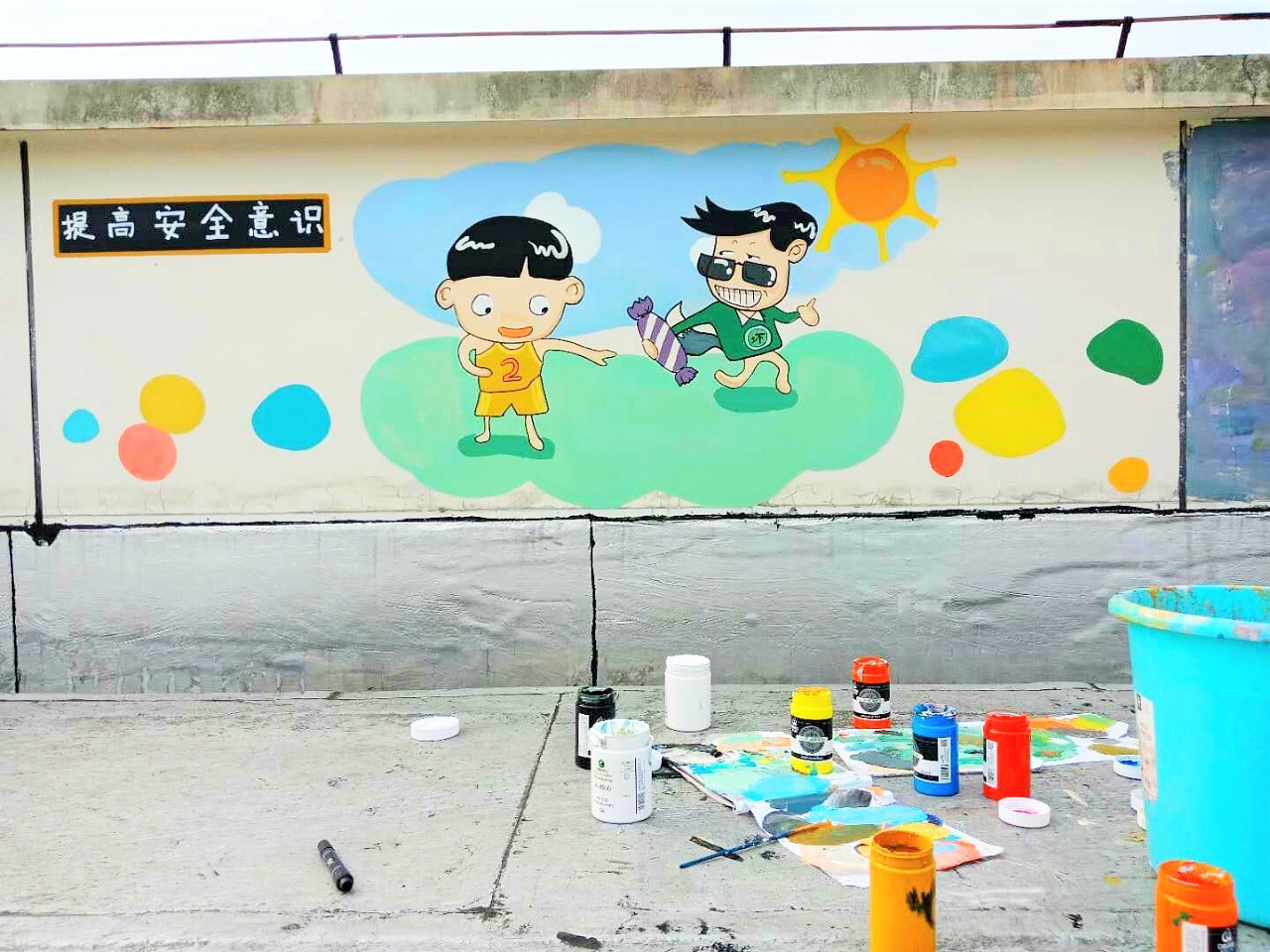 涂鸦是一种文化,一种艺术,更是一个心灵的窗口。同学们陆陆续续的来到了指定地点,随即投入到作画当中,每位同学都非常的认真。同学们用画笔画出了心中的理想,激励了创新精神与健康个性,原本有些破损的白色墙上留下了一幅幅的创作作品似乎变得有色彩有生机起来。由于大赛主题内容是提高孩童对自我保护和防范意识的培养,这个主题在让同学们挥洒自己创意的时候又带着一丝严肃,也希望通过这次的活动来提示大家注意自己身边的孩童安全,这次的活动时长两天,时间很短但是这次的内容的含义却非常的深远。真正意义上的涂鸦艺术家大多数都和帮派无关,他们都是来自底层的穷人,同样是一群有想法的人。这次在美院天台上的涂鸦大赛,给了同学们一个释放自己的机会,让他们在挥舞的画笔和浓厚的颜料中创造自己。接近涂鸦艺术,把它带入生活,美化了我们的天台,也美化了心灵。