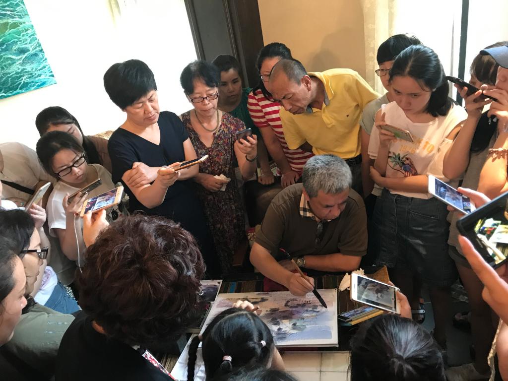 水彩,顾名思义,就是以水为媒介调和颜料作画的表现方式。那么,一幅有灵魂的水彩是怎样生成的呢?李利民老师不仅分享了自己的写生、创作经验及心得,例如作画技巧、风格调子的形成、画面处理等技巧,给大家带来很多干货;而且通过对水彩的生动讲解及阐述,以及现场动手边作画边讲解的方式,让我们对水彩有了更深的认识与理解。活动期间,读者朋友热情参与,现场互动与提问不断。由李老师亲笔签名的10份《李利民水彩画精选》作为随机抽奖奖品也为互动增添了热烈氛围。