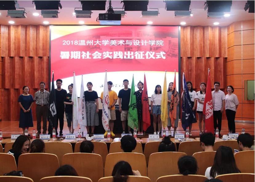 2018年7月4日下午,由美院团委学生会学术实践部举办的2018年暑期社会实践出征仪式在雁山厅隆重举行。出席此次会议的有必赢bwin线路检测中心党总支副书记杨振海老师,蚂蚁行动实践队指导老师许丽慧老师,艺韵晚霞实践队指导老师胡文超老师,绘暖向南实践队指导老师叶筱卉老师。 大会首先由必赢bwin线路检测中心实践负责人付秋圆同学介绍2018年实践队基本情况和实践注意事项。2018年必赢bwin线路检测中心共十支实践队,三支校级品牌提升项目,三支重点团队和四支一般团队,其中八支队伍都是美院传承了多年的队伍,当然今年也有两支全新的实践队。接下来是蚂蚁行动实践队代表发言,蚂蚁行动是成立于2014年,他们从温州前往云南迪庆藏族自治州进行支教,期间曾为当地村民解决了农产品滞销问题,进行了科普宣传和义诊,还建立了蚂蚁行动图书馆,蚂蚁行动今年也将带着这份责任,再次前往美丽的彩云之南,开始2018年暑期社会实践活动。大会第三项议程,必赢bwin线路检测中心学院党总支副书记杨振海书记讲话,杨书记提到实践队外出实践团队意识.形象意识等方面的重要性,同时也对各个实践团队寄予了期望。接下来是全体宣誓,由2018年暑期社会实践学生代表李树鹏同学领誓,全体同学宣誓。 最后杨书记为参加本次社会实践的10支队伍授旗,并集体合影留念。