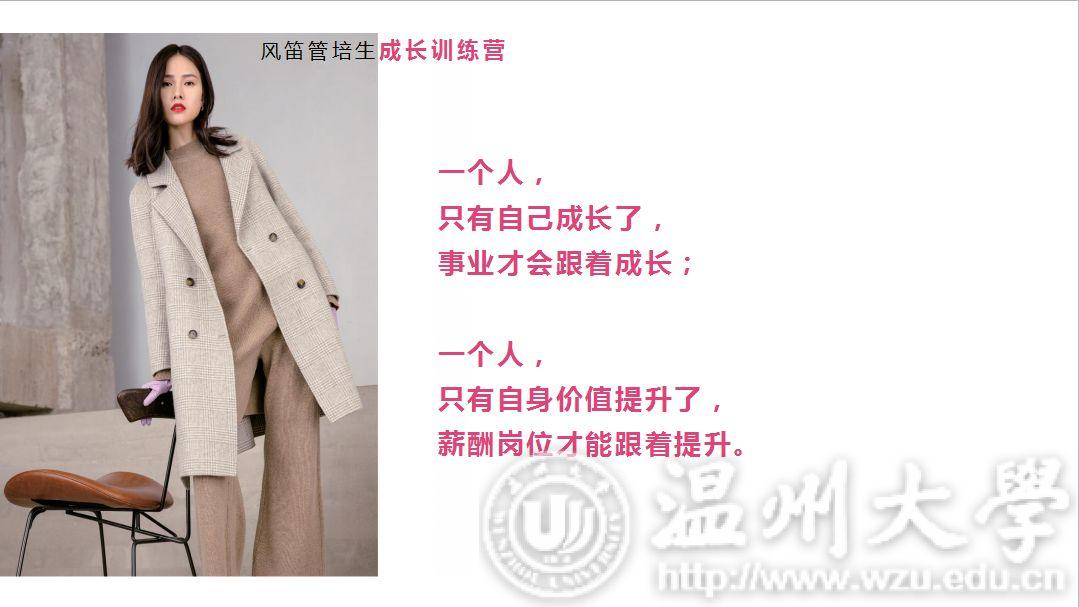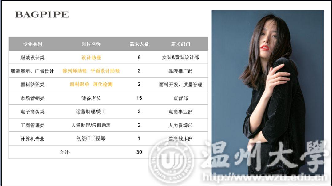 10日19日上午,Bagpipe风笛2019无限想象全国高校巡回宣讲会在美院顺利展开。在多年的合作与交流当中,风笛与温大也结下了不解的情缘。本次宣讲会有学院党总支副书记杨振海与风笛服饰有限公司经理吴朝晓莅临宣讲会现场。 首先是杨书记致开场词,在同学们热烈的掌声中,杨书记侃侃而谈。“温州风笛服饰有限公司与温大美院搭建了一个非常典型的校企合作平台,风笛公司作为我校省级校外实践教育中心,与必赢官网在专业教学、实习实训、就业创业等领域开展全面战略合作,我们非常高兴看到风笛公司一直以来欣欣向荣的发展态势,也希望双方能携手结出更多合作成果。” “不忘初心,使命必达。”风笛宣讲人缪老师在分享风笛创始人创业史、发展史,讲述风笛的过去、现在与未来,同学们都听的津津有味。宣讲会在主持人和同学们的互动中开始后,主持人分别从公司品牌设计风格,员工的衣食住行娱,薪资问题和管培生培养计划等几个同学们关心的方面来介绍风笛服饰有限公司的细节。BAGPIPE风笛成立于1999年,是一家自主开发、生产、销售时尚女装和童装的品牌经营企业。风笛公司的女装品牌分为周末时尚,摩登帅气,精致优雅三个风格,而风笛公司的童装品牌的定位则是针对2-8周岁的儿童设计的,风格多样是风笛公司的优势所在。衣食住行方面,风笛公司也非常重视员工的感受,为他们提供了舒适的环境以便于员工们更好的工作和生活。同时,风笛公司也十分重视对人才的培养,也有一套完整的体系进行人才的引入。这便是风笛管培生培养计划的由来。对于进入风笛上班的应届生,风笛建立了完善的“管培生培养计划”,全面打造“一专多能”的复合型人才,让每个进入风笛的应届生迅速成长,成为独当一面的技术或管理人才。在经过由系统培训、店铺见习、核心轮岗和专岗实践四个环节的管培生培养计划之后,实习生便能更好地融入公司这个大集体。说到薪资方面的话题,风笛公司的PPT上有着这样一段话:“一个人,只有自己成长了,事业才会跟着成长。一个人,只有自身价值提升了,薪资岗位才能跟着提升。”从这段话中我们也可以清晰地看到风笛公司对人才和员工能力的重视。对于服装设计、服装展示、广告设计、面料纺织类的专业,风笛公司也提供了如设计助理、陈列师助理、平面设计助理、面料跟单、理化检测的专业让同学们选择,以便给予同学们更大的就业空间。 “风笛未来,无限可期。”这是这场宣讲会的结束语。无限可期的不仅是风笛的未来,也同样是我们美院同学们明媚的未来。正如主持人所说,人生不设限,未来就会精彩无限。我们也相信同学们在一番拼搏之后,会绽放出人生绚丽的芳华。