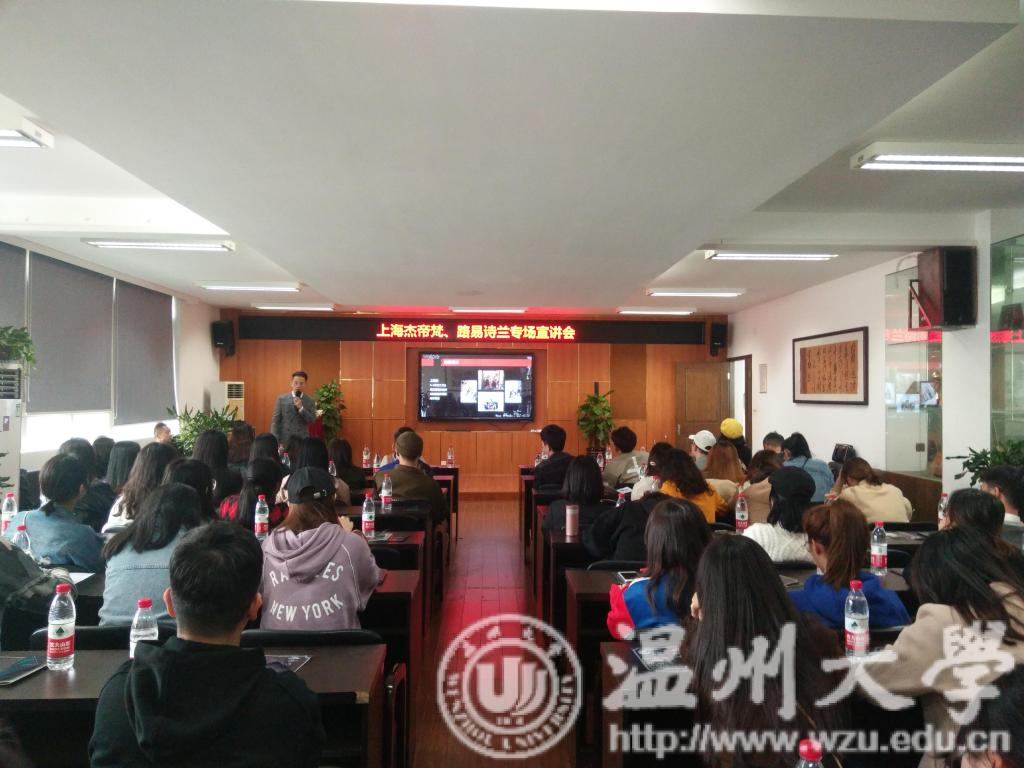 11月23日上午,由上海杰帝梵、路易诗兰组织的必赢bwin线路检测中心专场宣讲会在美院2B4001成功举行。出席此次宣讲会的主要宣讲人有杰帝梵和路易诗兰的战略部总经理朱量和培训部经理陈超群。会议内容主要是品牌的概述、管培生项目的介绍以及面试的流程。