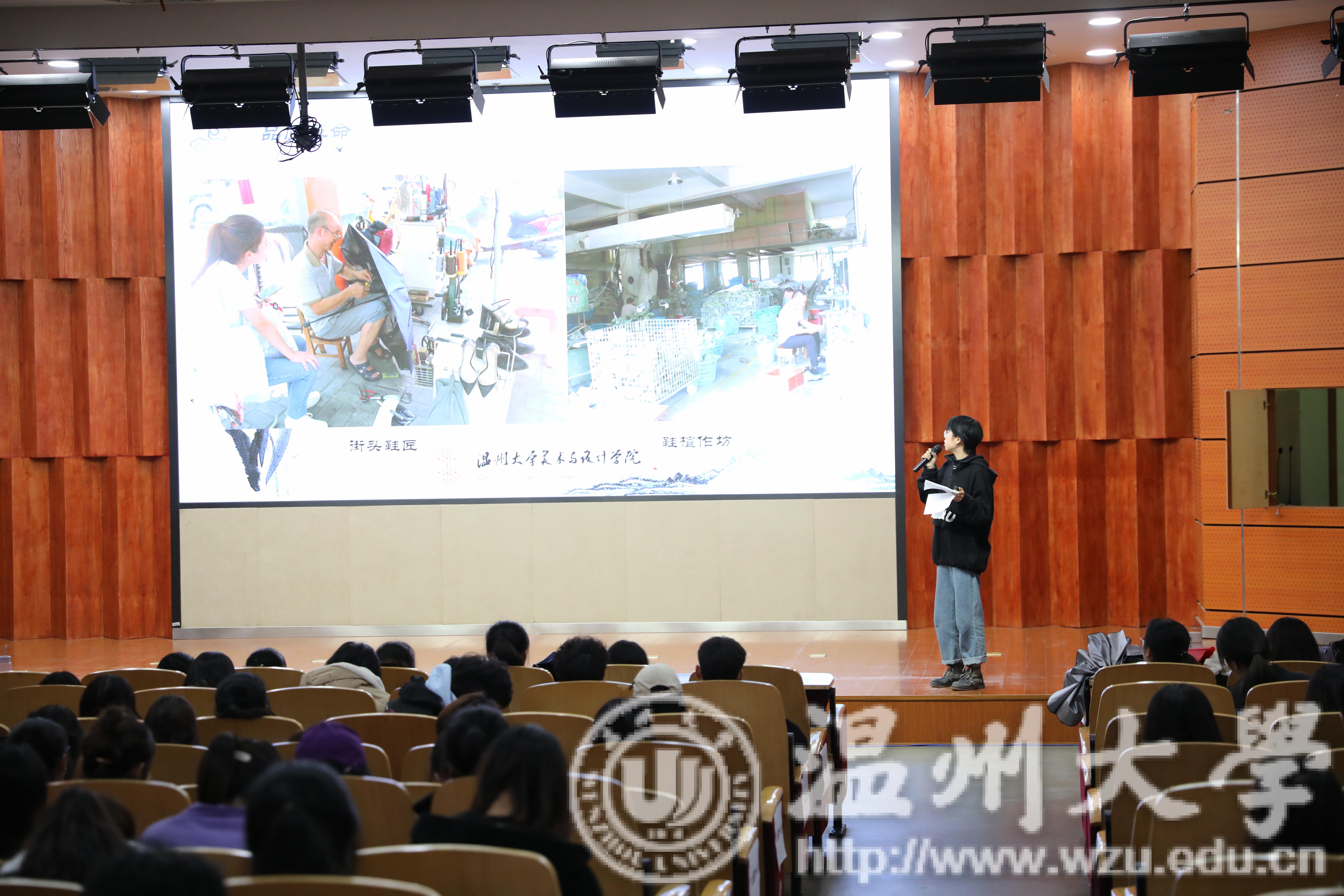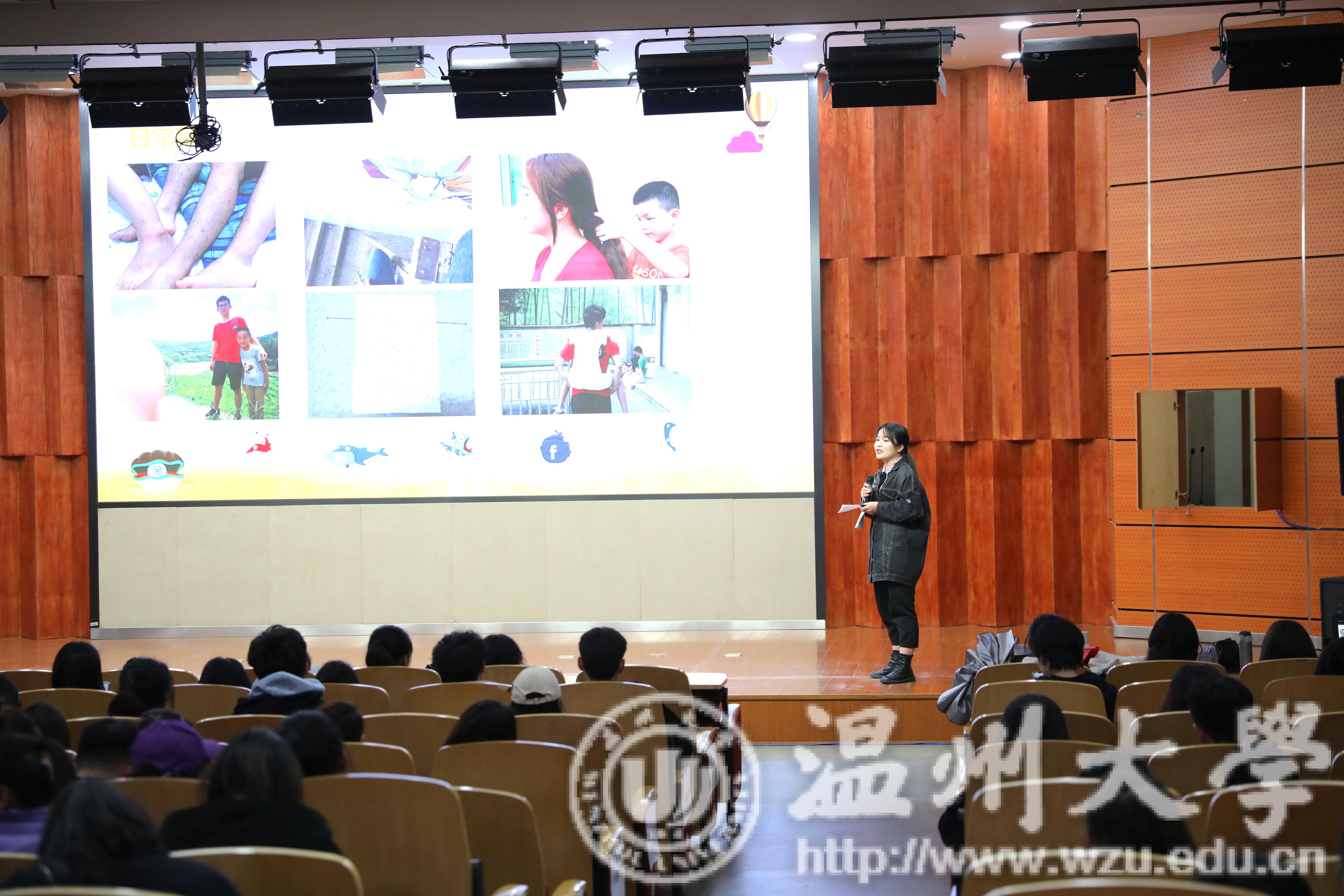 接着,2018年优秀实践队队长分享他们的收获与感受,“鞋蕴传承”实践队的队长介绍他们的队伍,包括主要工作,课余生活,成果汇报,经验心得分享等。他们以鞋靴产品为主,皮制品为辅,结合自身专业的优势开展社会实践活动,在活动中很好地诠释了如何把理论与实践相结合,得到了鞋靴企业的大力支持,并取得了可喜的成绩。接着是“绘暖向南”的实践队队长介绍,实践队于16年成立,他们支教一所山村小学,秉承启发孩子们“走出去”的思想与理念,用艺术重饰校园,他们开展了一次独出心裁的墙绘之旅;他们希望用教育改变未来,举行了一次意义非凡的支教之行;他们用温暖传递文化,演绎了一场热泪盈眶的青春记忆。两位队长通过各自各具特色的展示,并结合自身经历,让大一同学们对社会实践有了一个初步的认识。