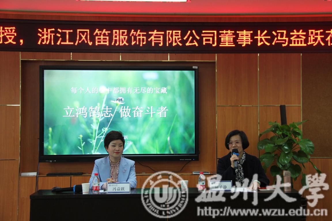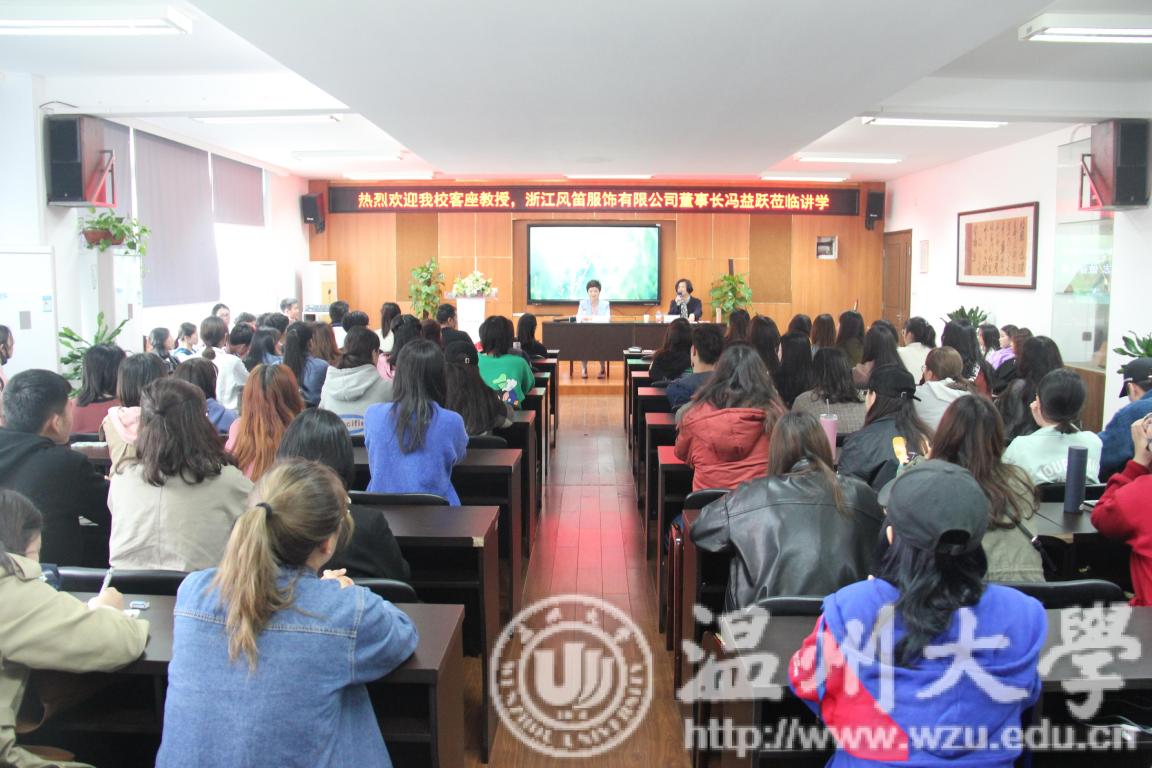 3月28日下午,我校客座教授、浙江风笛服饰有限公司董事长冯益跃女士莅临必赢官网讲学,主题为《立鸿鹄志,做奋斗者》,学院院长李运河教授、副院长谢子静教授、学生科科长叶筱卉、服装与服饰设计教研室主任钟信群以及相关专业教师和学生参与观听,全场座无虚席。学院副院长谢子静教授主持。