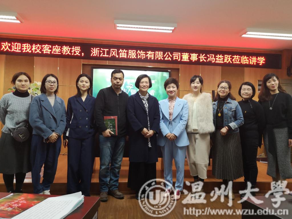 3月28日下午,我校客座教授、浙江风笛服饰有限公司董事长冯益跃女士莅临必赢官网讲学,主题为《立鸿鹄志,做奋斗者》,学院院长李运河教授、副院长谢子静教授、学生科科长叶筱卉、服装与服饰设计教研室主任钟信群以及相关专业教师和学生参与观听,全场座无虚席。学院副院长谢子静教授主持。 讲座主要围绕心、道、德、事四个层次,分别讲述冯董自己个人的创业史以及有关励志教育,案例生动形象,内容深入浅出,她以平实亲和的语言教导在座的莘莘学子,要立鸿鹄志,勇做奋斗者。充分展现了一个无私无我、奉献社会的新时代成功企业家形象。 在为时两个半小时的讲座结束后,同学们热情不减,积极互动提问,作为我校客座教授的她均一一热情予以解答。会后,与会成员合影留念。