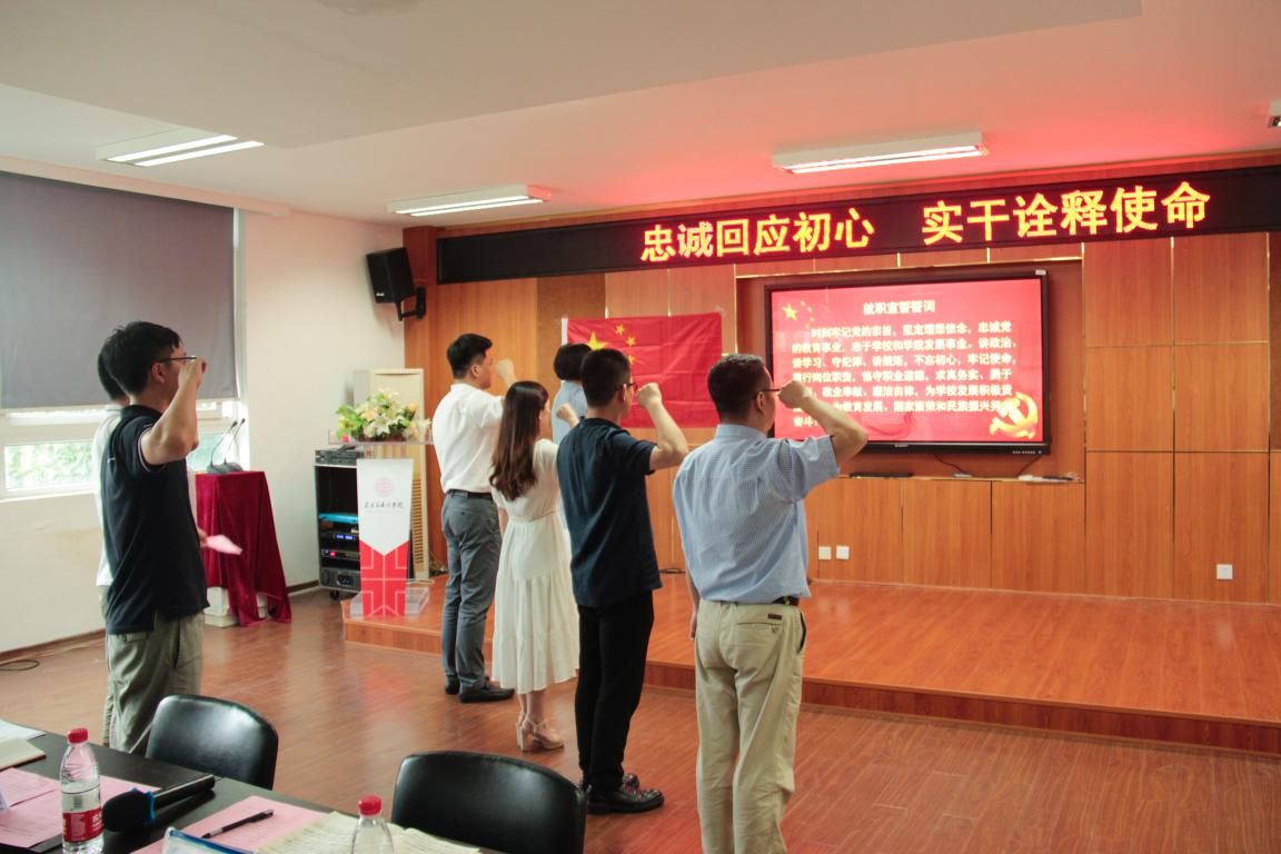 2019年7月7日下午15:30,必赢bwin线路检测中心党委为更好的贯彻落实学校党委关于“不忘初心跟党走,牢记使命勇担当“为主题深入开展“红七月·服务月”活动。学院党委深入开展“五带头”活动,带头寻初心,在学院2B4001举行了“忠诚回应初心 实干诠释使命”必赢bwin线路检测中心领导班子及科级干部重温入党誓词暨任职宣誓仪式。