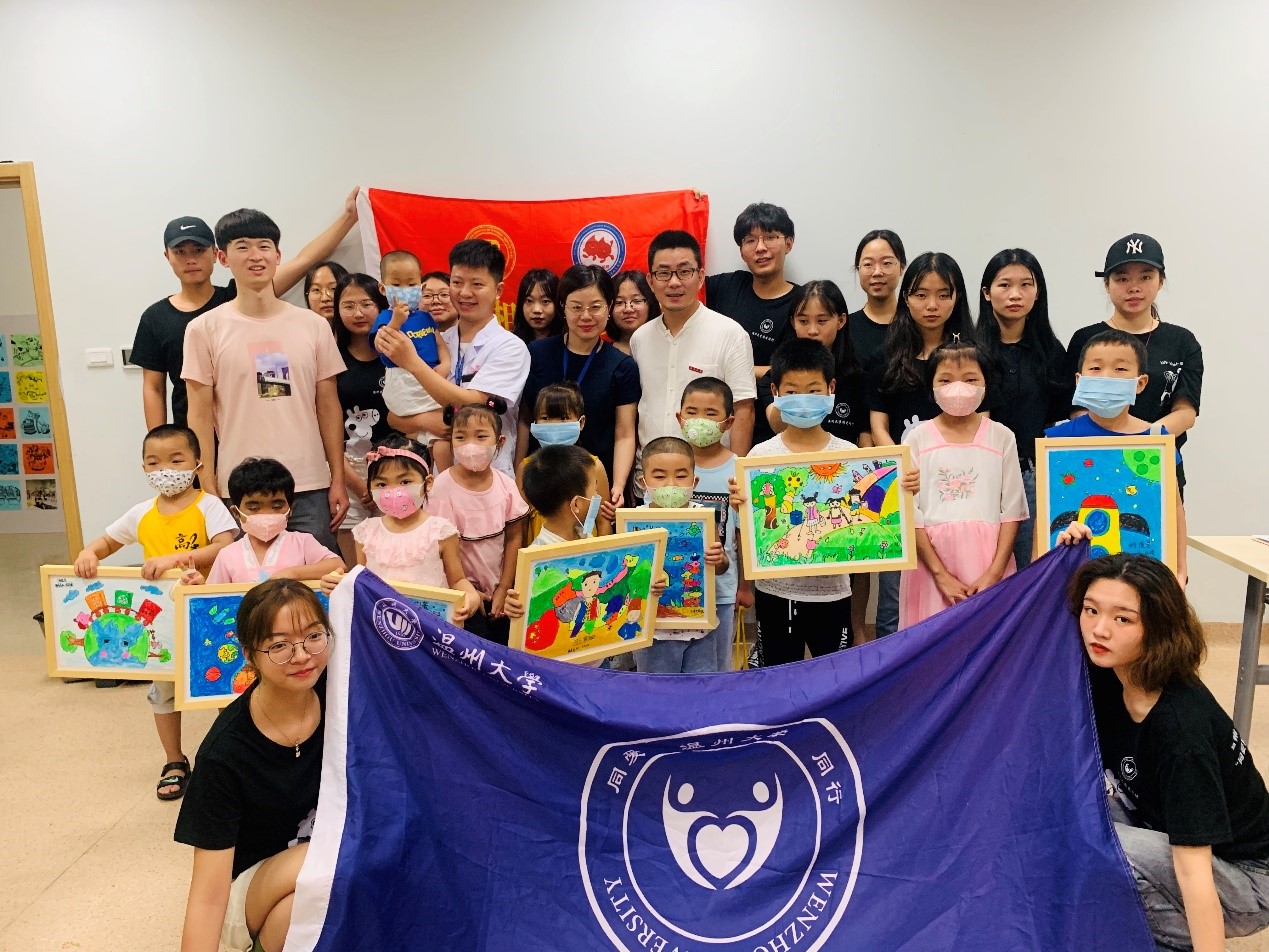 同爱同行”暑期社会实践队是一支由美院、外国语学院、教师教育学院、数电学院、建工学院和生环学院等学院学生组成的暑期实践队,共有22名队员,由许丽慧老师指导。该队伍致力于关爱特殊人群(尤其是生理与心理存在障碍的儿童)开展暑期托管、主题墙绘、问卷调查、社会现象调研、文献资料学习交流和宣传影音资料拍摄推广等实践推广。 2019年7月18日上午十时许,必赢bwin线路检测中心副院长胡文超慰问了正在温州医科大学附属第一医院开展 “艺助成长,艺心医意” 关爱特殊儿童的“同爱同行”暑期社会实践队。 刚到医院,胡院长一行受到了温州医科大学附属第一医院团委书记尚蕾蕾、血液内科余志杰博士的热情欢迎。随后在医院团委书记的带领下,胡院长参观了门诊大厅的巨幅浮雕、爱心献血屋及爱心书屋地带,胡院长被此处的摄影绘画作品所吸引,通过交流,胡院长和尚书记期待未来更深层次的合作。 随后,胡院长一行来到位于二楼血液内科的教学教室,与实践队员进行了深入的交流沟通,充分肯定了实践队在实践活动中所做的努力。胡院长走到小朋友中间,和小朋友交谈互动,看着小朋友们可爱的笑脸,胡院长也很欣慰。胡院长勉励同学们一定要有耐心,给孩子们带去最好的关爱,为他们留一下一段美好的回忆。胡院长对实践队这段时间为孩子们带来的欢乐表示感谢,并强调了大学生暑期社会实践的重要意义,鼓励大学生树立责任意识和奉献精神,通过实践服务社会,增长才干。最后,胡院长为同学们送去了慰问品。 胡院长的慰问给同爱同行团队的队员带来了极大的精神鼓舞,让队员们在接下来的实践活动中充满干劲,也明白了青年大学生肩负的时代责任和历史使命。队员们接下来会继续以更加饱满的热情投入到实践活动中去。