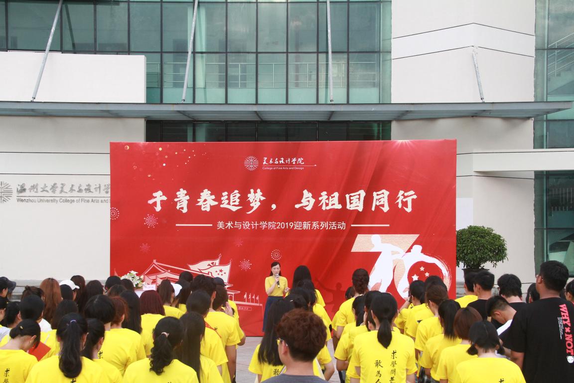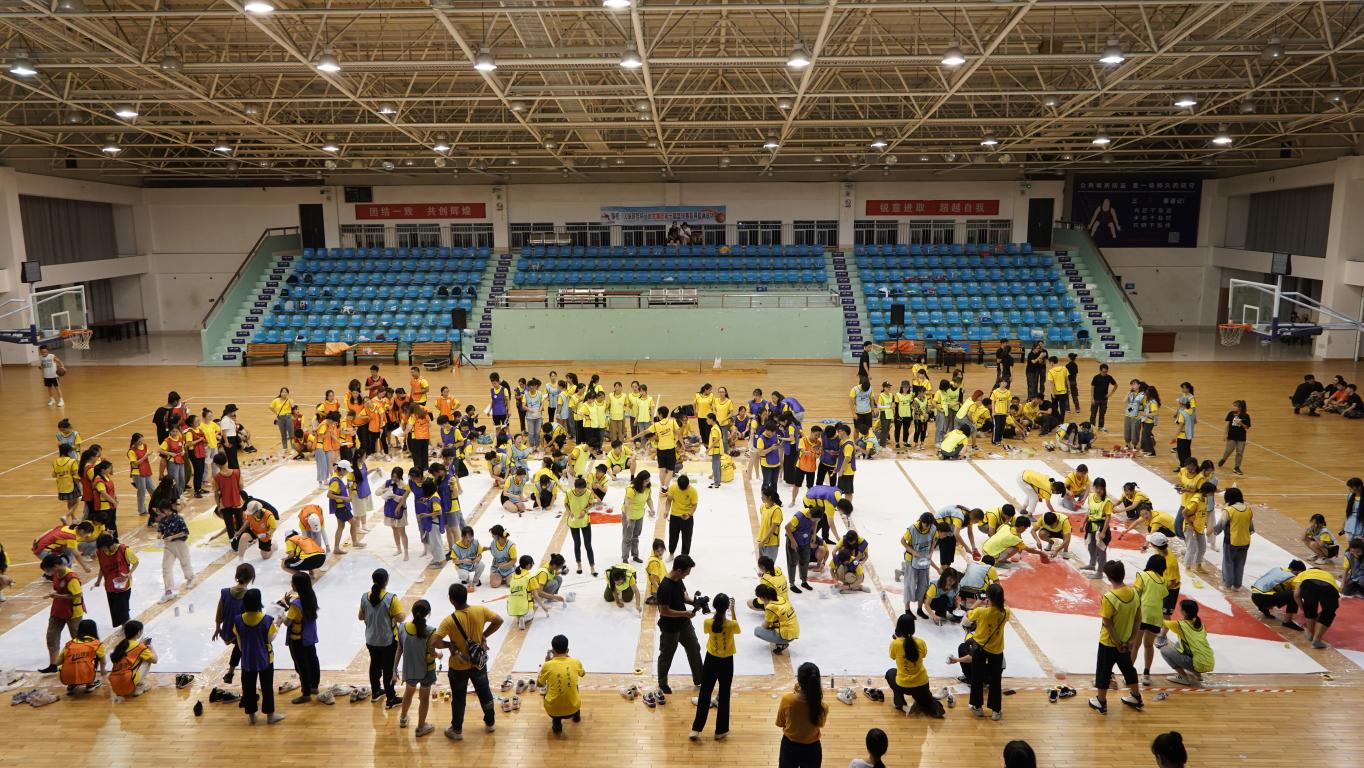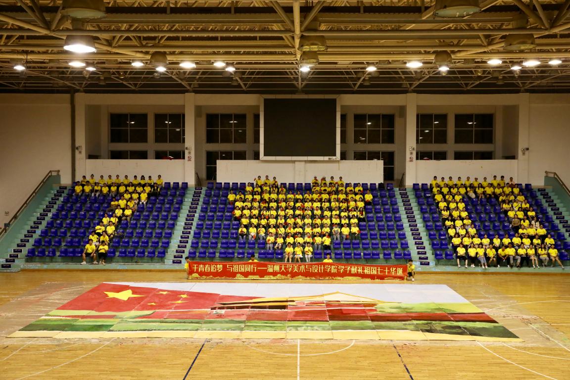 气势磅礴的口号,手中挥舞的五星红旗,用心设计的定向任务卡,16米长的巨幅画作……9月15日下午,必赢bwin线路检测中心举办“于青春追梦,与祖国同行”迎新生、庆国庆活动。活动分为定向素拓和巨画绘制两部分进行,旨在祖国70华诞来临之际,携手全体新生,向新中国成立70周年献礼。 活动开幕副书记杨丽君致辞 266名美院新生参加,他们统一身着黄色校服,朝气蓬勃活力无限,在必赢bwin线路检测中心“飞行部落”培训师的指导带动下,团结努力,最终完成“能量传递”、“团队悦动”、“一圈到底”三关定向挑战。通过活动,不仅培养了新生团队精神,增进了健康体魄,更通过精心设计的定向运动任务卡展现了新中国变迁,传递了浓浓爱国情与民族自豪感。 266名新生共绘国庆巨画 全体新生摆出“70”字样献礼祖国70华诞 随后,266名新生齐聚温大篮球馆,在必赢bwin线路检测中心这个崭新的起跑线上,他们用手中的颜料与画笔,用艺术专特长与热情,共同绘制10*16m国庆主题巨画《我爱祖国》,画出了浓墨重彩的一笔。最后,在266人、花费3小时共同完成的画作旁,全体新生摆出“70”字样,齐声喊出“祝伟大祖国繁荣昌盛”,献礼祖国70华诞,展现了温大青年学子的爱国情怀和使命担当。